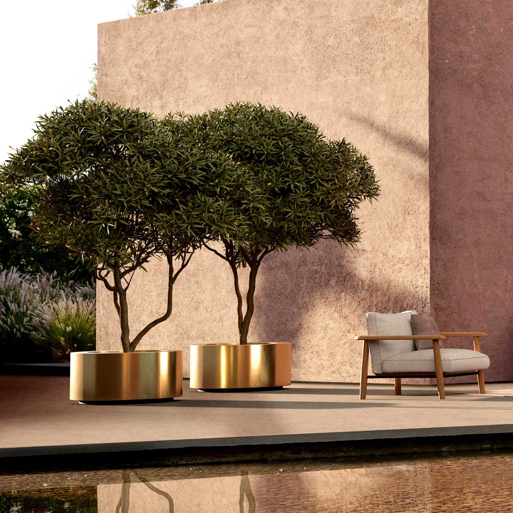 類稀なるワイドな真鍮プランターは、邸宅のテラス、ホテルのエントランスなどにさりげなくアートの香りを漂わせます。