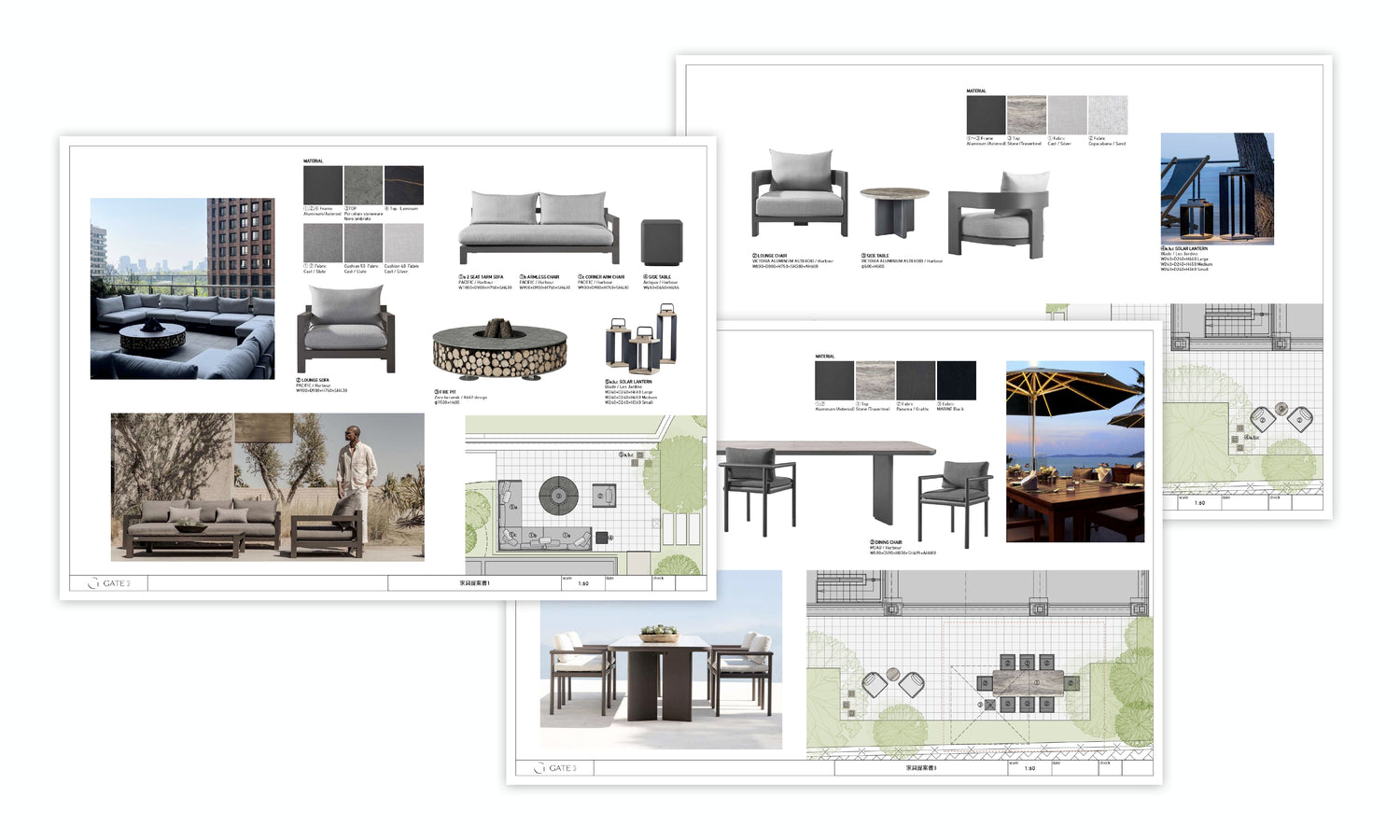 ホテルや別荘の屋外プランの実績のあるデザイナーがおりますのでご安心ください。屋外はお客様の過ごし方と環境に合わせたアイテム選定が重要です。図面作成が必要な相談に関しては有料にてお受けしております。詳しくはお問い合わせください。
